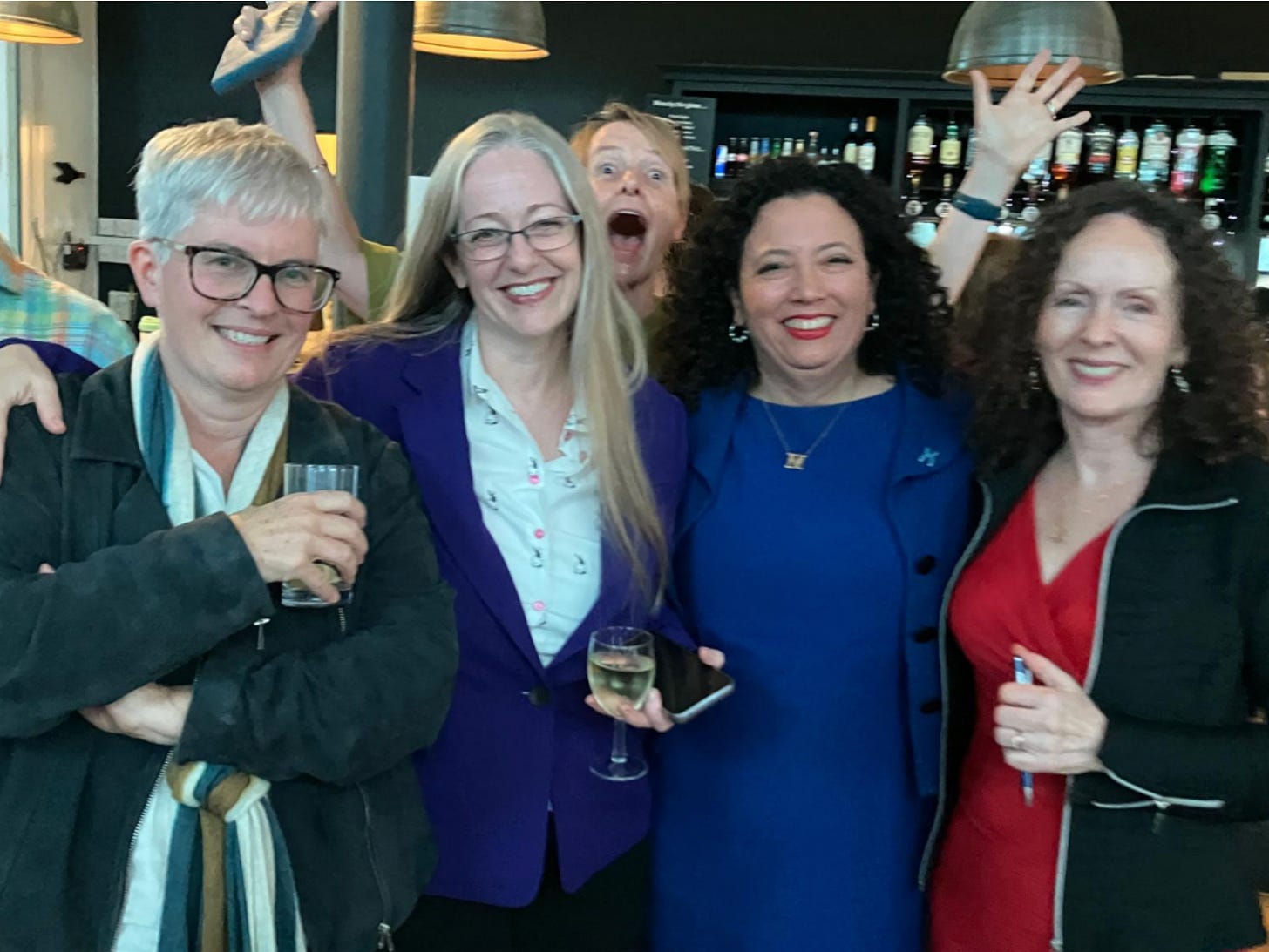 Naomi Cunningham, Helen Joyce, Maya Forstater, and Fiona McAnena (Emma Moore photobombing) – photo by Beck Laxton
