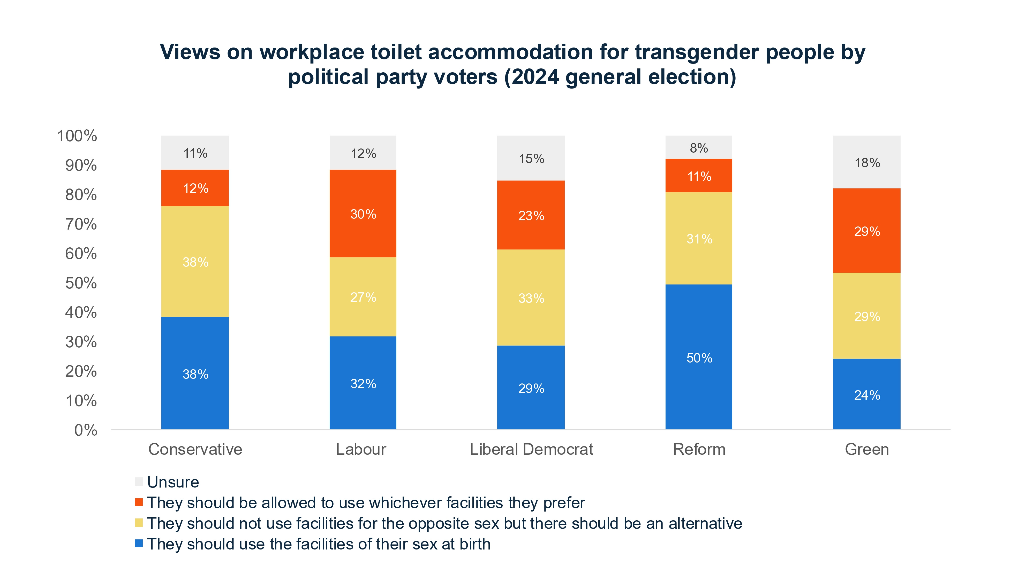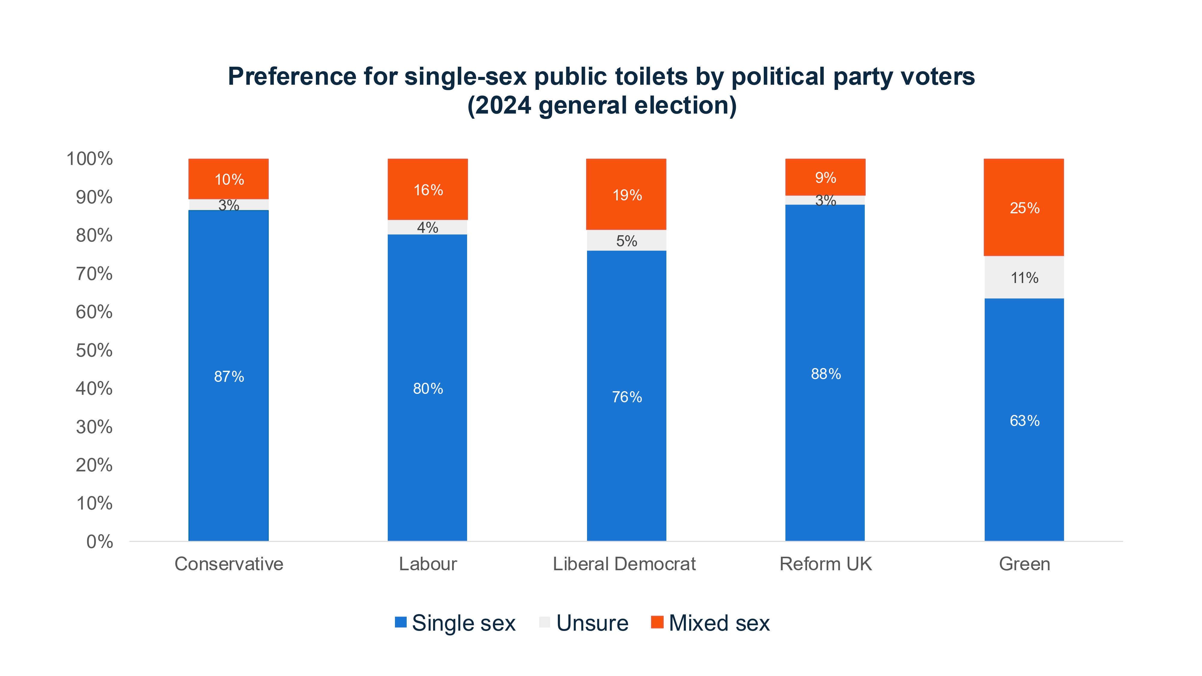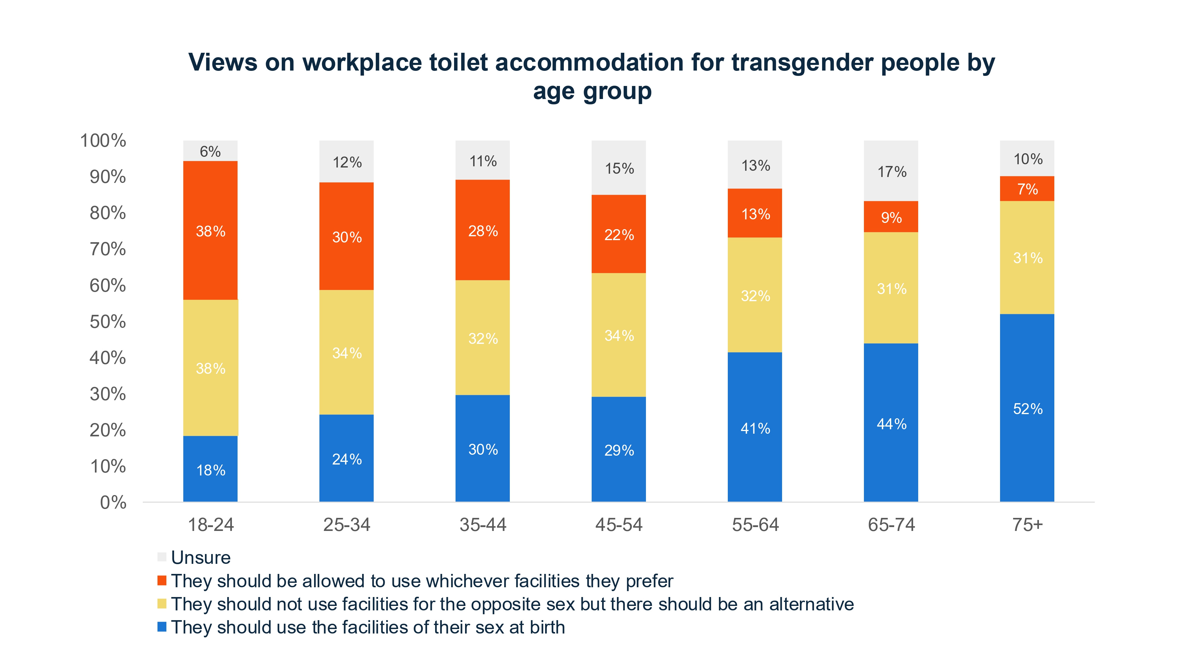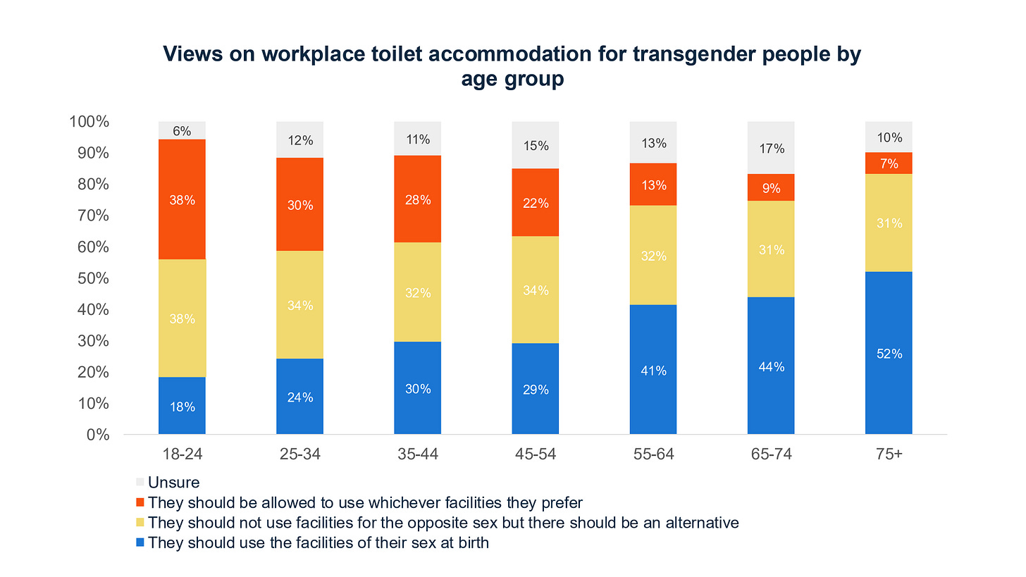 The vast majority of people prefer straightforward single-sex facilities in workplaces and public spaces. Most do not agree that trans-identifying people should be allowed to use the facilities of their choice. This varies little by age or voting pattern.