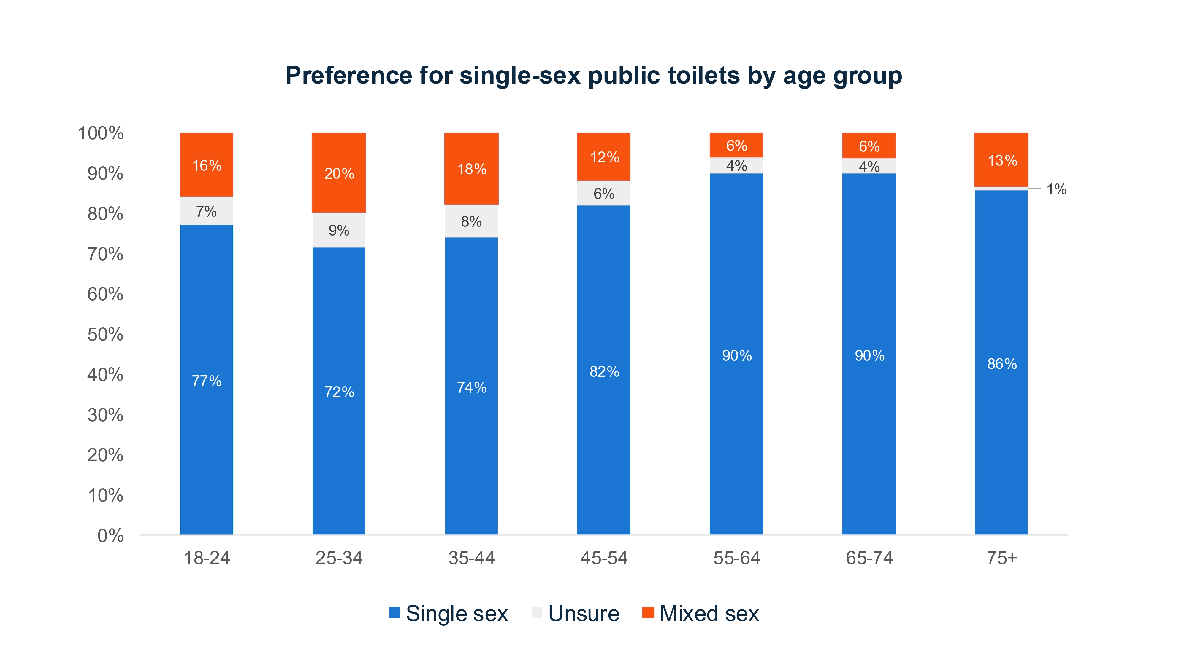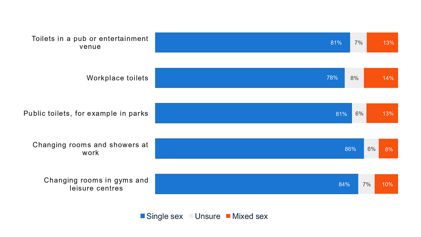 The poll shows that most people prefer single-sex facilities over “gender neutral” (mixed-sex) provision. This is a consistent preference that hardly varies across all the situations we asked about, from workplace toilets (78%) to toilets in parks and pubs (81%) to showers and changing rooms at work (86%).