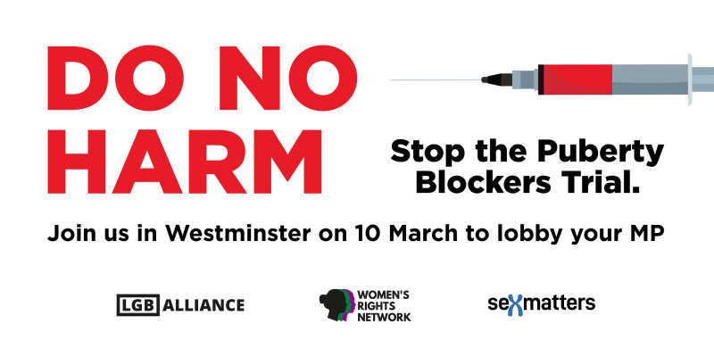 On Monday 9th March there will be a Westminster Hall debate on the trial, and a lobby day that we are organising along with the Women’s Rights Network and LGB Alliance on Tuesday 10th. This is your chance to educate MPs about why the trial has been paused and why it should not now go ahead at all. Children are still being put at risk by social transition in schools, cross-sex hormones are being provided online and widespread legal misrepresentations are leading young adults to alter their bodies in the mistaken belief that it is their right to insist society at large plays along with the fiction of “sex change”.