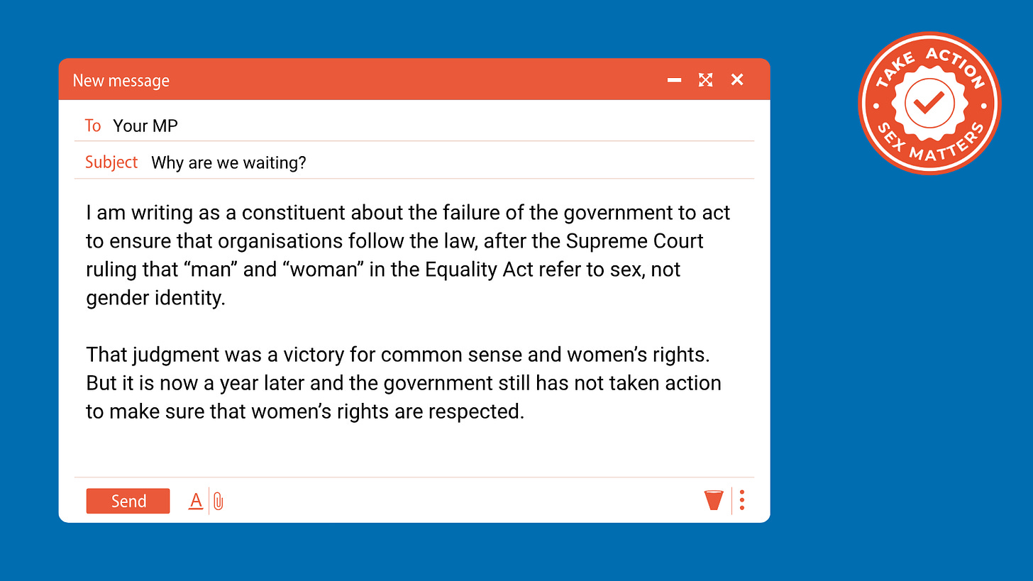 By now all MPs will have received the booklet in their pigeonholes. If you haven’t written to your MP about this, now is a good time. Ask them to urge the Minister for Women and Equalities to lay the EHRC guidance before Parliament in May, as she has promised, and to act decisively to ensure that the law as clarified by the Supreme Court is enforced.