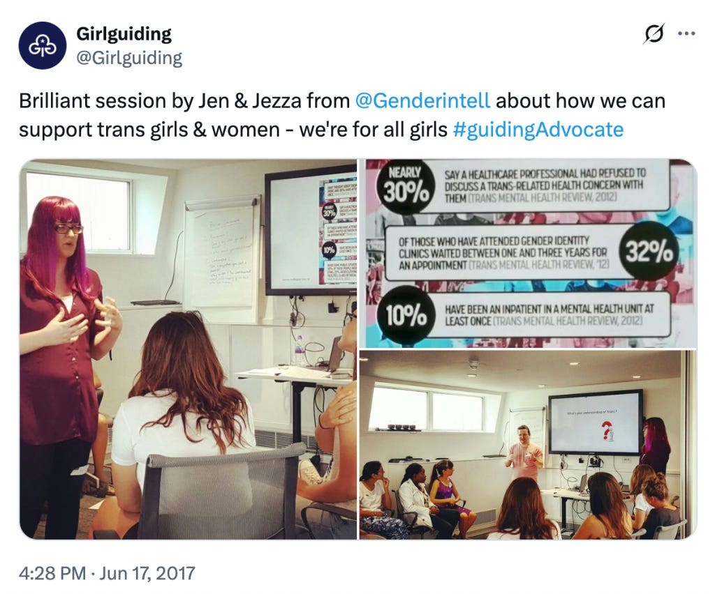Girlguiding adopted its policy after consulting with Gendered Intelligence. As shown in this tweet featuring trainer Jezza Donnovan, Gendered Intelligence shared the usual suicide scare statistics (read our factsheet on why these are irresponsible myths).